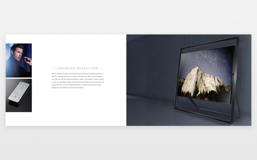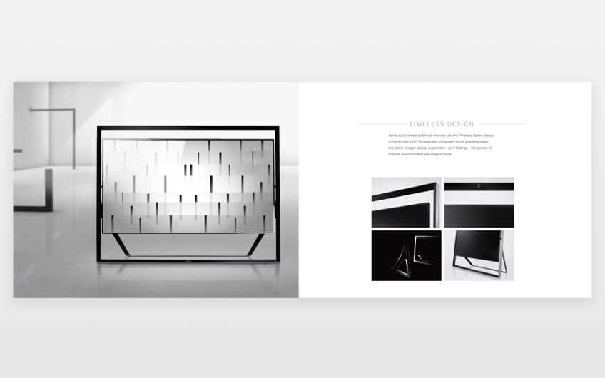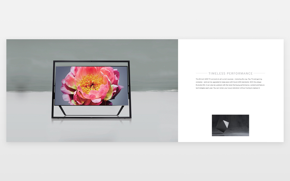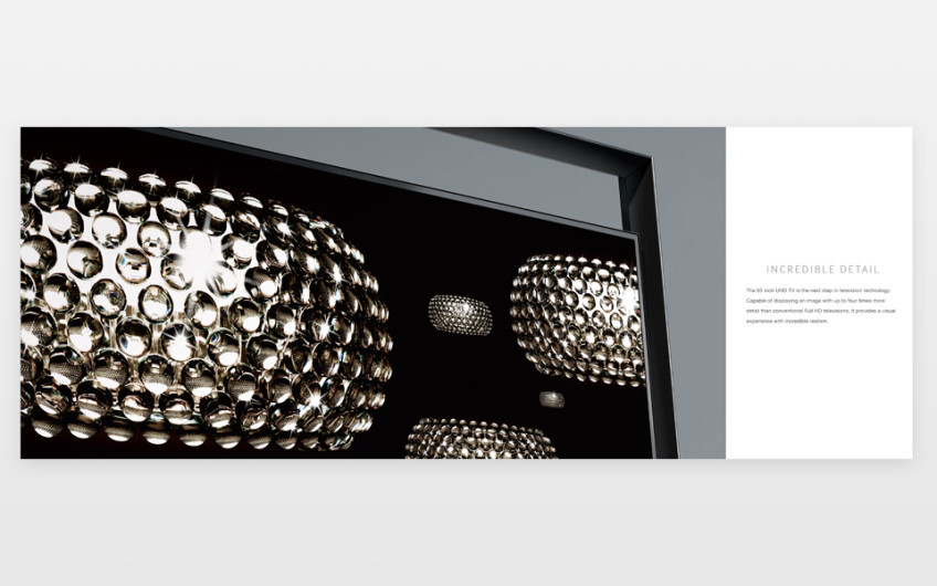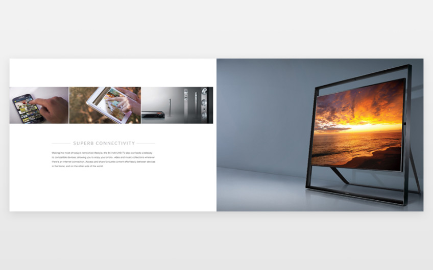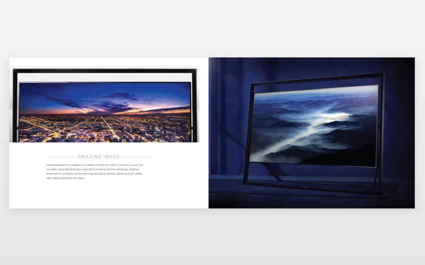 This was a catalogue to promote UHD technology and I decided to create a upmarket style brochure to highlight the elegance and style of the new TVs. We printed this brochure on satin stock with a spot varnish/embossed cover to emphasis the look and feel of these new TVs.