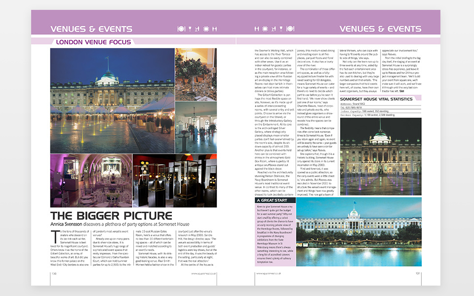 SquareMeal magazine is a guide to restaurants and venues in the square mile in London but also businesses outside London. My role included designing magazines, art directing photography shoots and web design. I worked with the Art Director, Editor and Restaurant Reviewers to achieve this and was lucky enough to be able to work with some great chefs. We also had a website where I worked with the developers to design graphics for the website and also created custom rich-HTML EDMs which was sent to magazine and website subscribers.
